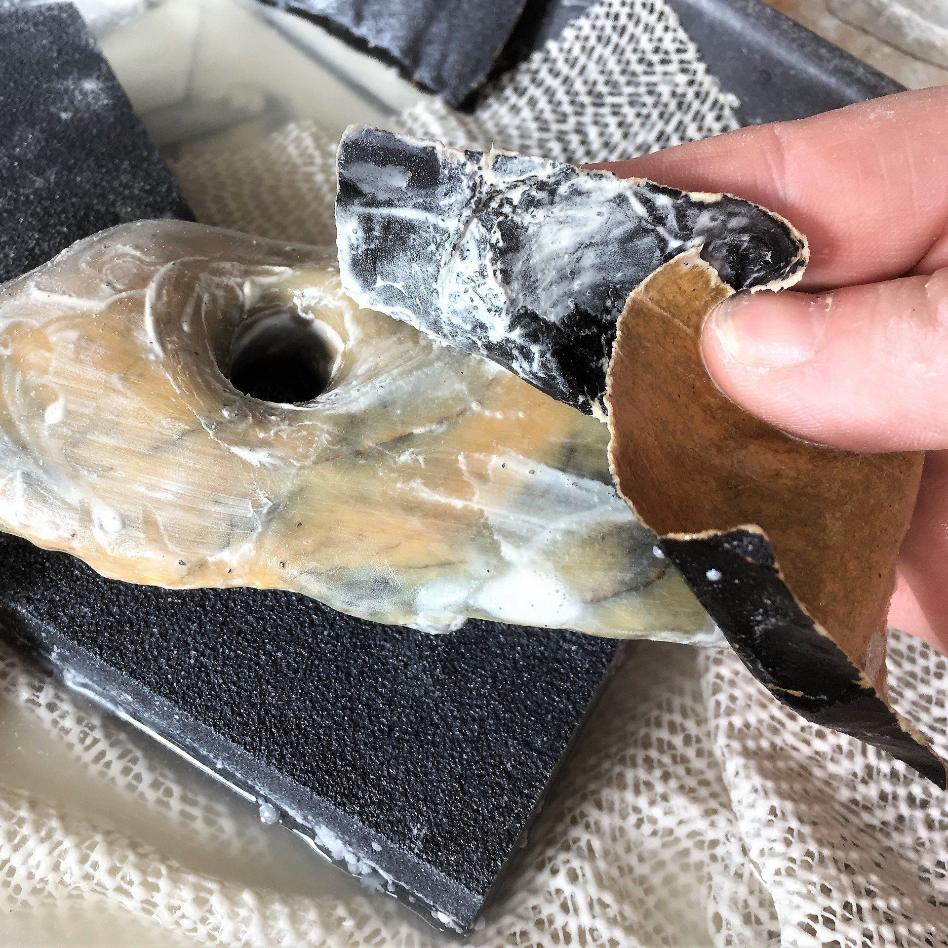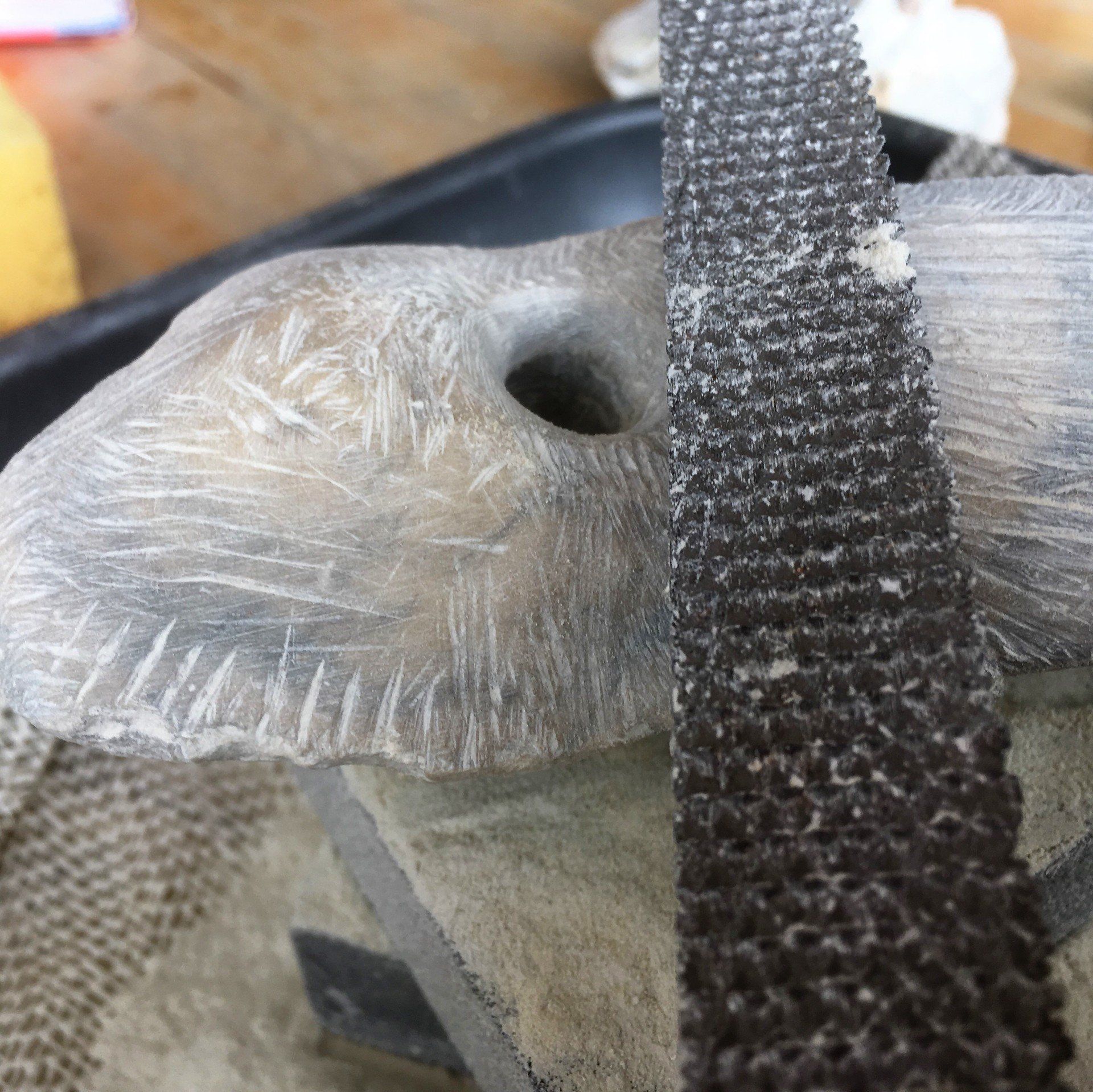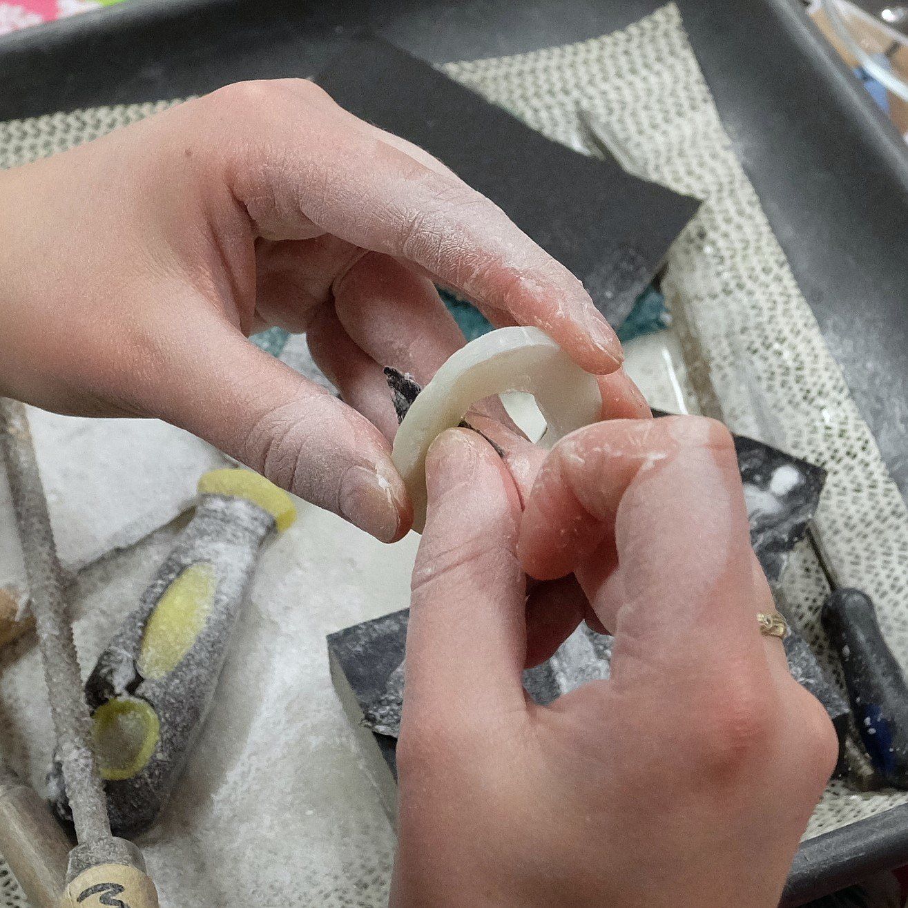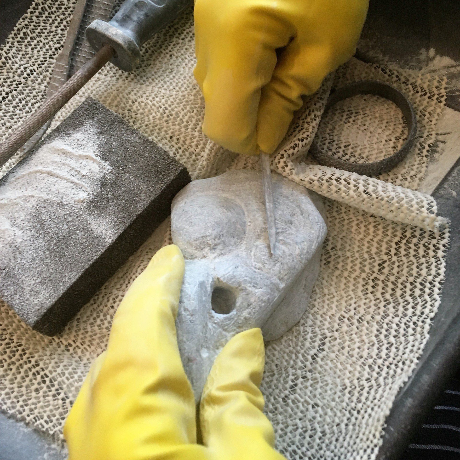 Tijdens de workshop doorlopen we alle stappen die tot een volwaardig eindproduct leiden. Eerst kiezen we een mooi stuk steen uit, maximaal vuistgroot. We kijken goed welke vorm al in de steen ‘verstopt’ zit. Door middel van raspen komt de ruwe vorm tevoorschijn. Daarna gaan we de vorm verfijnen door te vijlen en schuren. Met water en waterproof schuurpapier in verschillende gradaties polijsten we de delen die we glad willen maken. De speksteen beeldjes worden daarna gedroogd met een föhn en in de was gezet.